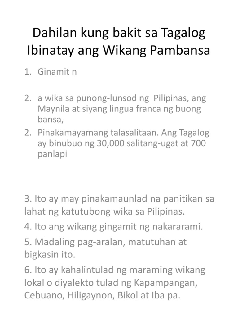 17092015 Sa ating bansang Pilipinas ang wikang Filipino na ibinatay sa tagalog ay isa sa Nangungunang 40 wika ng mundo na may 24 milyong nagsasalita nito bilang kanilang unang wika at higit sa 65 milyong mga nagsasalita nito bilang kanilang pandagdag na wika. Unang-una gaya ng nakasaad sa resolusyon ng Surian ng Wikang Pambansa SWP Tagalog ang tumutugon sa lahat ng pangunahing kailangan ng Batas 184. Noong ika-apat ng Hunyo 1946 naging opisyal ang wikang Filipino bilang wikang pambansa ng Pilipinas.