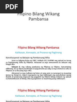 Samantalang nililinang ito ay dapat payabungin at pagyamanin pa salig sa umiiral na wika sa Pilipinas at sa iba pang mga wika. 16102020 Sa unang bahagi ng Artikulo XIV Seksiyon 6 ng Konstitusyon ng 1987 nakasaad na Ang wikang pambansa ng Pilipinas ay Filipino. 06082013 Sa panahon ng Komonwelt sa pangunguna ni Pres.