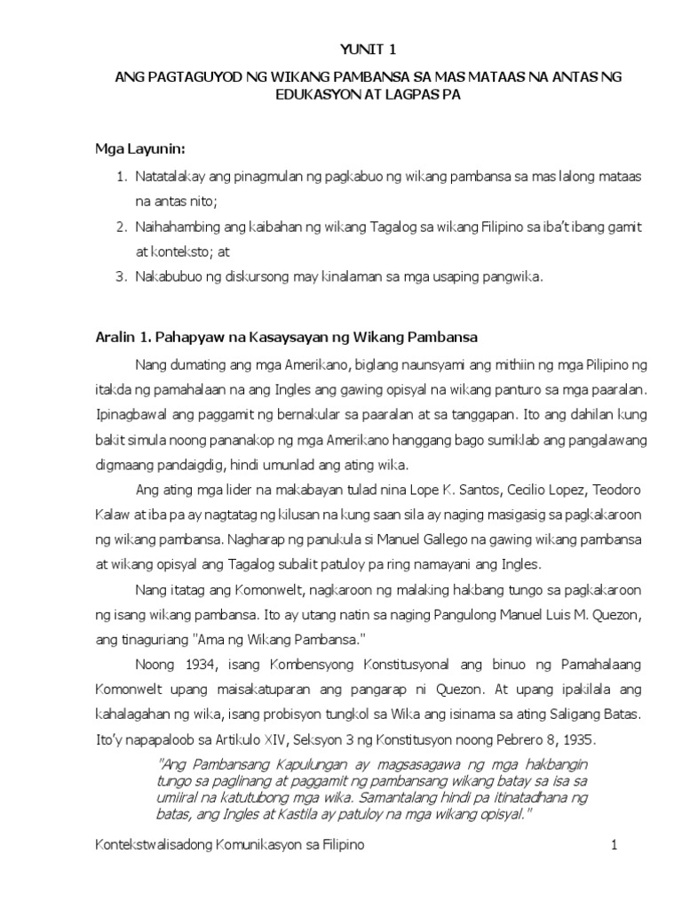 Idinelklara ni dating Presidente Manuel L. 21082020 Hindi ba nararapat lamang na bigyan ng angkop na pagpapahalaga ang sariling wika o ang wikang Filipino sa murang edad pa lamang bago iprayoridad ang wikang dayo. 26102020 Alinsunod sa mga tadhana ng batas at sang-ayon sa nararapat na maaaring ipasya ng Kongreso dapat magsagawa ng mga hakbangin ang Pamahalaan upang ibunsod at puspusang itaguyod ang paggamit ng Filipino bilang midyum ng opisyal na komunikasyon at bilang wika ng pagtuturo sa Sistemang pang-edukasyon.