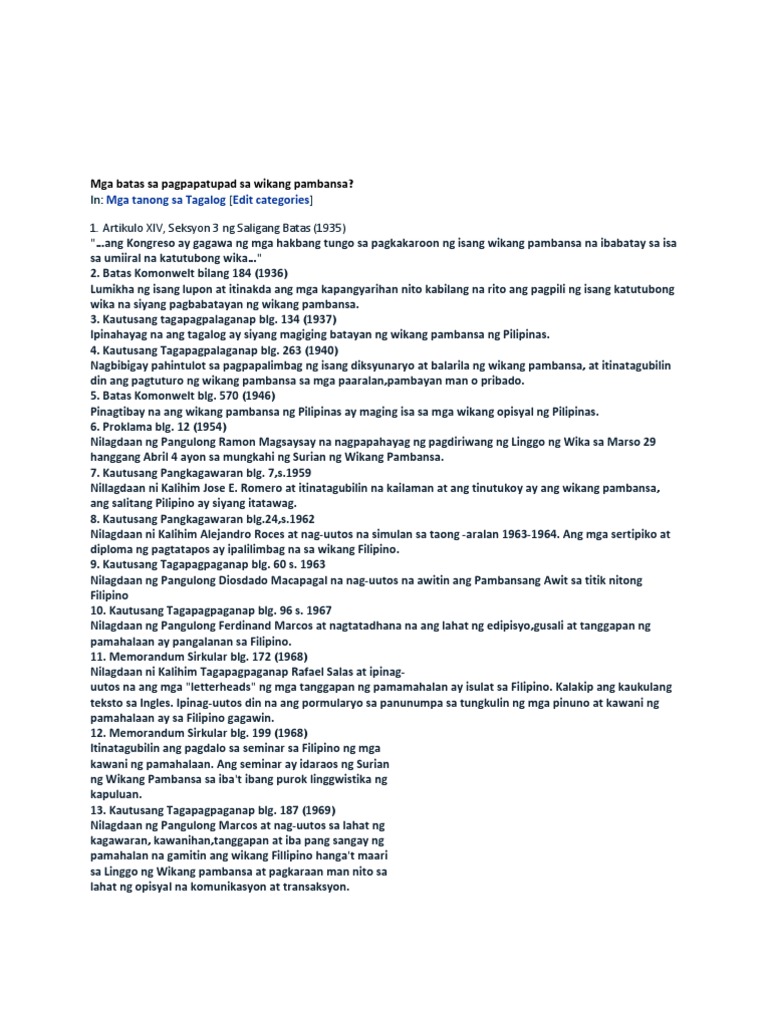 Mga Batas At Kautusan Na May Kinalaman Sa Wikang Pambansa Docsity