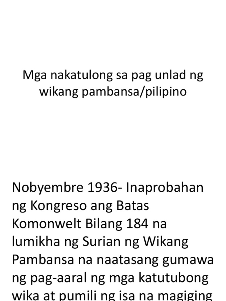 Samantalang nalilinang ito ay dapat payabungin at pagyamanin pa salig sa umiiral na mga wika ng Pilipinas at sa iba pang mga wika. Zulueta Pangasinan Zollo Hilario Kapampangan Isidro Abad Visayang Cebu Upang higit na maunawaan ang mahahalagang pangyayari sa kasaysayan ng Wikang Pambansa narito ang ilan pasa mga batans pangwika. MGA BATAS KAUTUSAN MEMORANDUM AT SIRKULAR NA MAY KINALAMAN SA WIKANG PAMBANSA 5.
