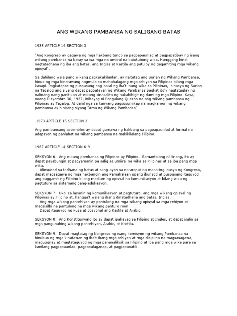 Ngunit hindi ito dahilan upang bawasan ang mga aralin patungkol sa kultura ng sariling bansa. Saligang Batas ng 1935 Ang Kongreso ay gagawa ng mga hakbang tungo sa pagpapaunlad at pagpapatibay ng isang wikang pambansa na batay sa isa sa mga umiiral na katutubong wika. Saligang Batas ng Biyak-na-Bato 1896 Ang Wikang Tagalog ang magiging opisyal na wika ng Pilipinas.