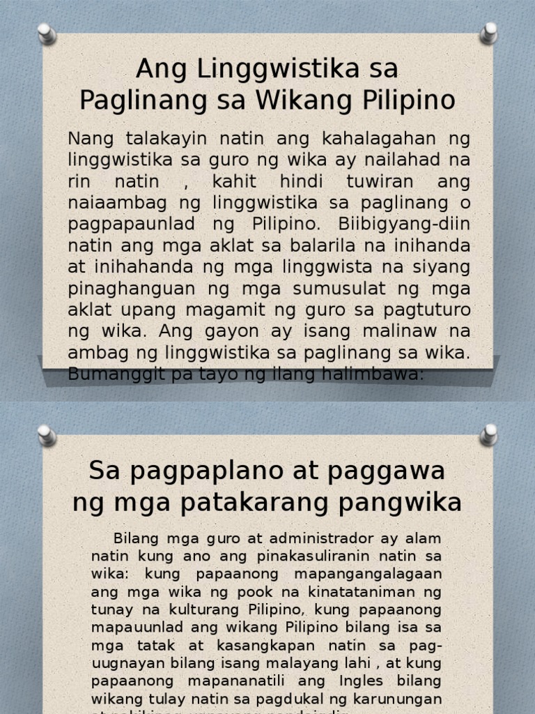 20112016 Pagpasok sa paaaralan ay hirap sa pag-aaral ng Wikang Filipino dahil nakagisnan ang paggamit ng Wikang Ingles. 21092020 Ang Linggwistika sa Paglinang sa Wikang Filipino Binigyang diin natin ang mga aklat na balarila na inihanda at inihahanda ng mga linggwista na siyang pinaghahanguan ng mga sumusulat ng mga aklat upang magamit ng guro sa pagtuturo ng wika.