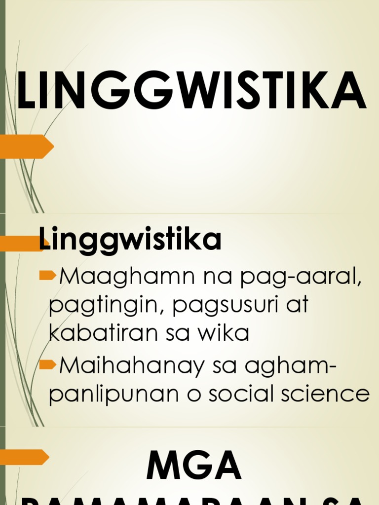 Ang linggwistika ay ang pag-aaral ng isang partikular na wika paghahanap at pagtukoy sa pangkalahatang katangian ng wika o ng mga pangkat ng wika. Kasama sa mga inaaral ng linggwistika tungkol sa wika ay ang ponetika ponolohiya morpolohiya syntax. Ito ang isa sa mabibigat na suliranin na kinahaharap ng mga guro sa pagtuturo.