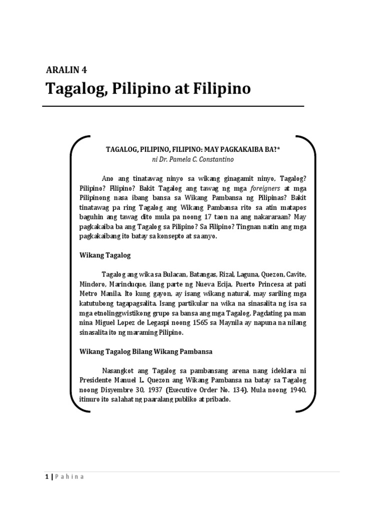 12042021 Gayundin nilaktawan ng Artikulo XIV Seksyon 6 ng Saligang Batas ng 1987 na ipinagbisa matapos ng pagpapatalsik kay Ferdinand Marcos ang anumang pagbabanggit ng Tagalog bilang batayan ng Filipino at mismong ipinagpatuloy na as Filipino evolves it shall be further developed and enriched on the basis of existing Philippine and other languages. 25012017 Idinadahilan nila na hindi lamang iisa ang dapat maging estilo ng Wikang Pambansa na batay sa ibat ibang wikain tayoy higit na magkakaunawaan bilang mga mamamayang Pilipino Tagalog Cebuano Ilocano Ibanag Kapampangan Muslim lahat. Ano ang kaibahan ng wikang Filipino at Tagalog.