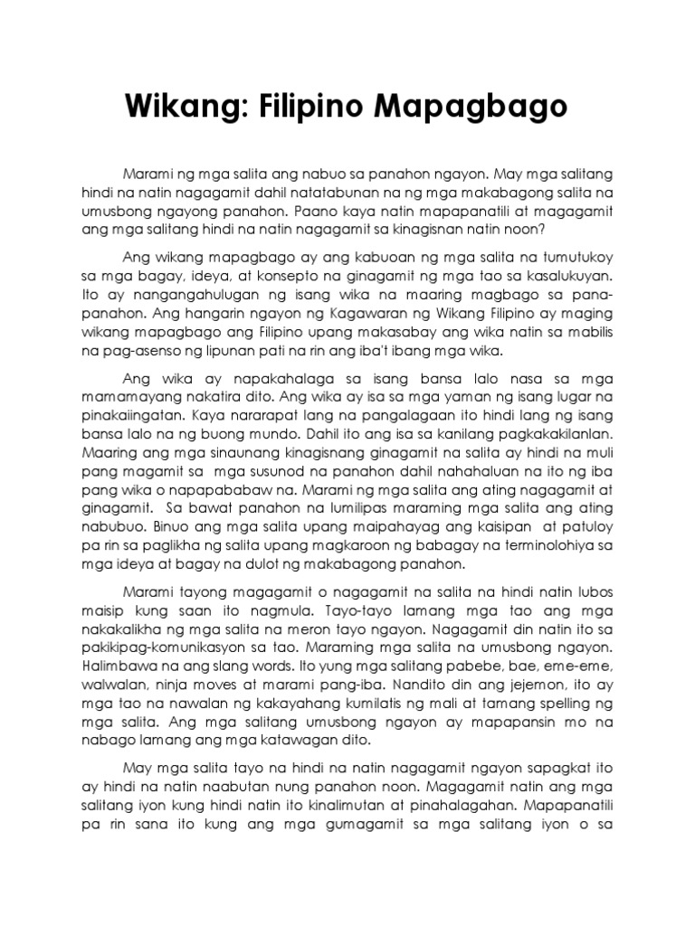 Sa Wikang Essay Filipino Mapagbago Para. Wikang Mapagbago Nakapaloob sa temang ito ang kahalagahan ng wikang Filipino bilang kasangkapan sa atin para sa isang adhikaing pagbabago tungo sa kaunlaran.