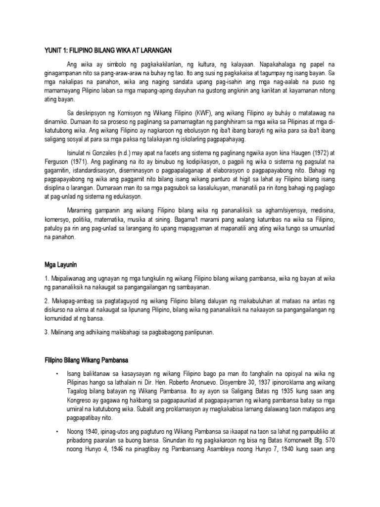 Kabanata I Kabanata I Filipino Bilang Wikang Pambansa Wika Ng Bayan At Wika Ng Pananaliksik Na Nakaugat Sa Pangangailangan Ng Sambayanan Panimula Course Hero