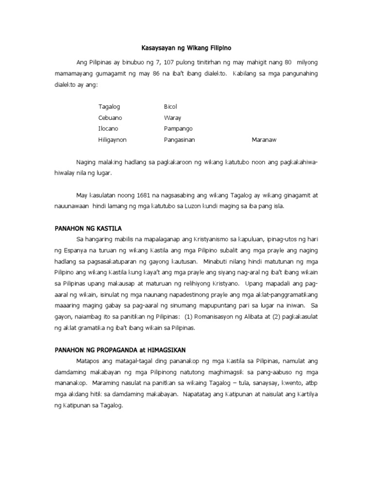Kasaysayan ng Wikang Pambansa mula sa Panahon ng Katutubo hanggang sa Kasalukuyan at Ang aking saloobin sa pagtanggal ng asignaturang Filipino at Panitikan s. Batay sa KWF Atlas ng mga Wikang. Ang bagay na itoy pinatutunayan ng mga mananalasysay na kastilang nakarating sa kapuluan.