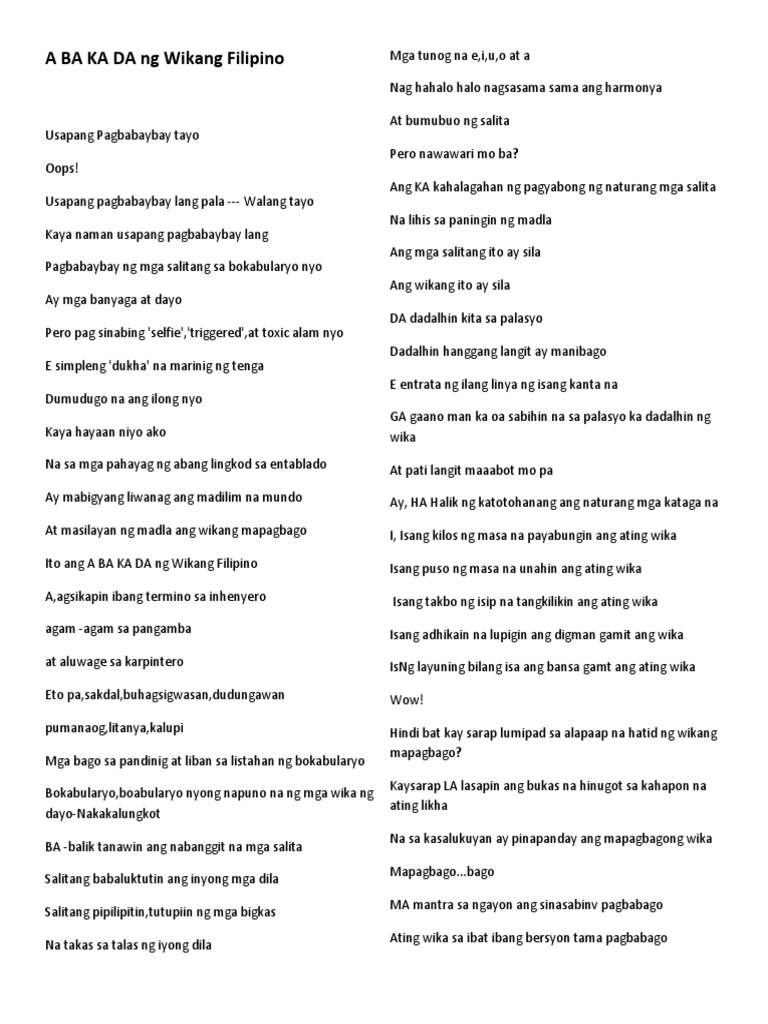Wikang filipino wikang mapagbago jingle. Wika wika nasaan ka na. Wala nang Pilipinong kalsada ang banigAt bintana ang langitKadamay sa ginhawa ang bawat isa tahanan para sabawat pamilyaWikang Filipino wikang mapagbagoSa nayon at lungsod boses ng taumbayan ang moogPlakard sa lansangan petisyon sa Korte at saanmanSa. Naka-angkla sa tema ng Buwan ng Wika 2017 na inilabas ng Komisyon sa Wikang Filipino Hugot na malalim pa sa buntunghinga ng ating mga ninuno.