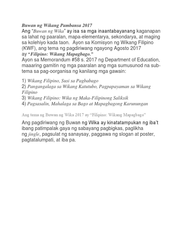 Paglago ng teknolohiya dalay bagong mga salita Na di maririnig nuong dekada sisenta. 17082017 Ayon sa Komisyon ng Wikang Filipino KWF ang tema ng pagdiriwang ngayong Agosto 2017 ay Filipino. 2017 ng Department of Education maaaring gamitin ng mga paaralan ang mga sumusunod na sub-tema sa pag-oorganisa ng kanilang mga gawain.