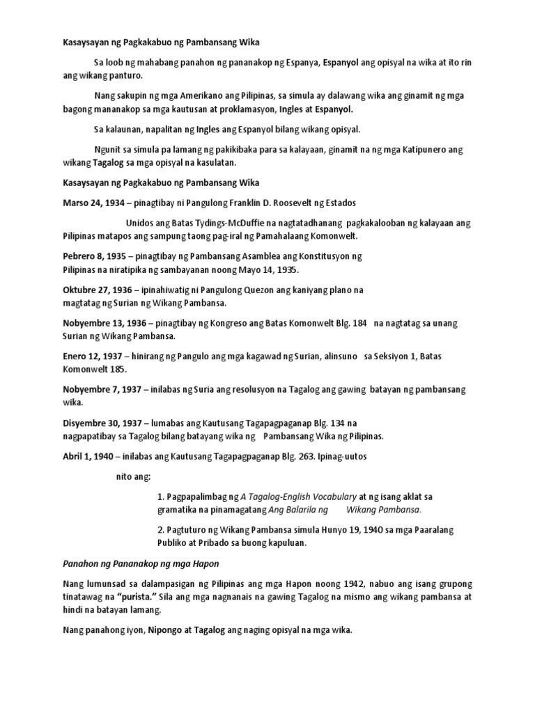 31082009 Mahalagang maintindihan ang kasaysayan ng Wikang Pambansa kung paano ito nagsimula bilang Tagalog kung saan umalma ang mga Bisaya naging Pilipino at ngayon nga ay Filipino na. Noong Disyembre 30 1937 mula sa bisa ng Executive Order No. Isang arkipelago ang Filipinas kung kaya nagkaroon ito ng maraming katutubong wika.