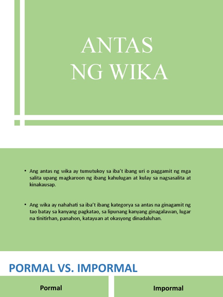 Antas Ng Wika Pormal Pambansa At Pampanitikan At Di Pormal Panlalawigan Kolokyal At Balbal Youtube