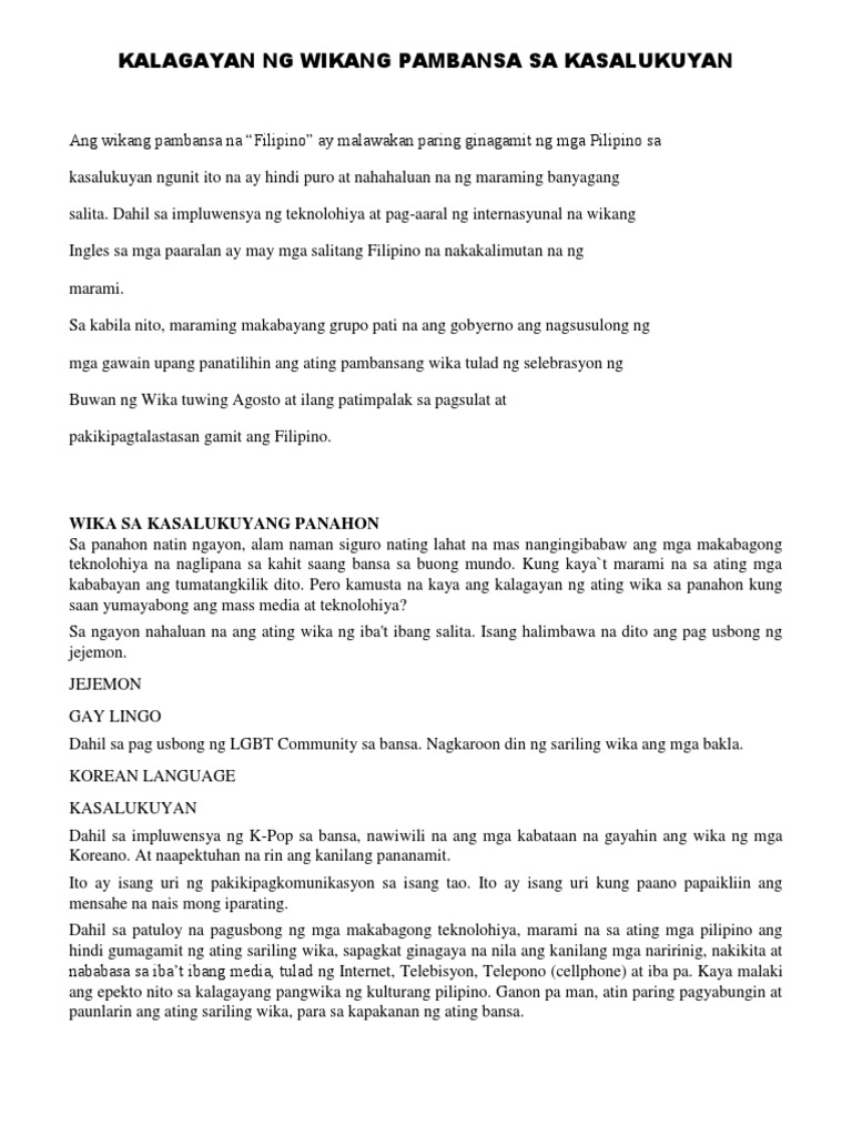 Sinasalita rin ang mga wikang banyaga tulad ng Ingles Mandarin Fookien Cantonese Kastila at Arabe. Ang karaniwang katwiran sa pangunahing wika ay dahil 1 may malaking blang ito ng tagapagsalita karaniwang umaabot sa. 07112020 Marami sa mga kabataan ngayon ang gumagamit ng ibat ibang pamamaraan ng pag sasalita kagaya ng jeje at beki languange dahil dito ay maaring makalimutan nila ang mga tamang paggamit sa wikang Filipino.